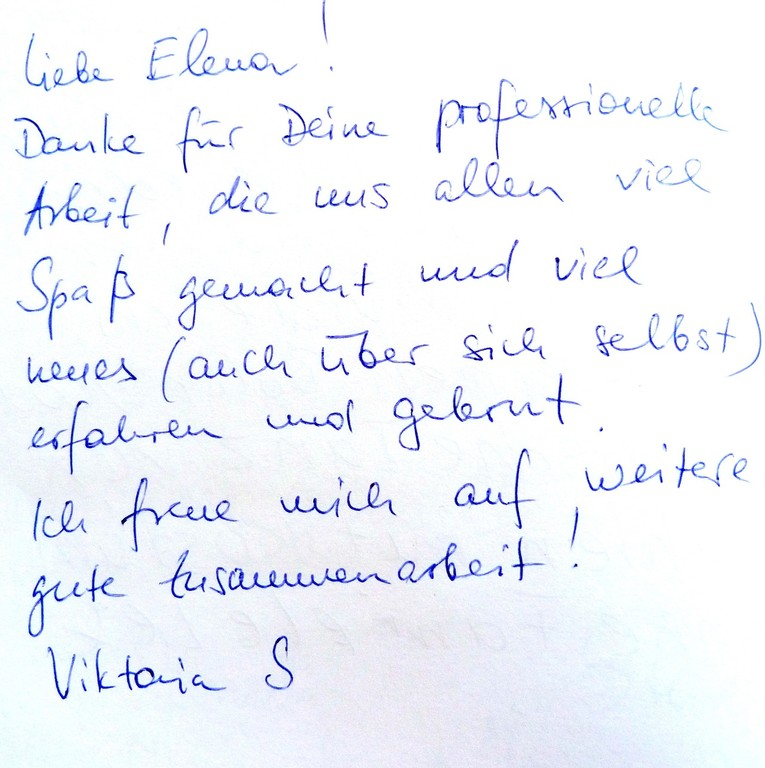 Hiermit wollte ich noch einmal Danke sagen. Danke für diese wunderbare Erfahrung und für die unglaublich tolle Hilfe.